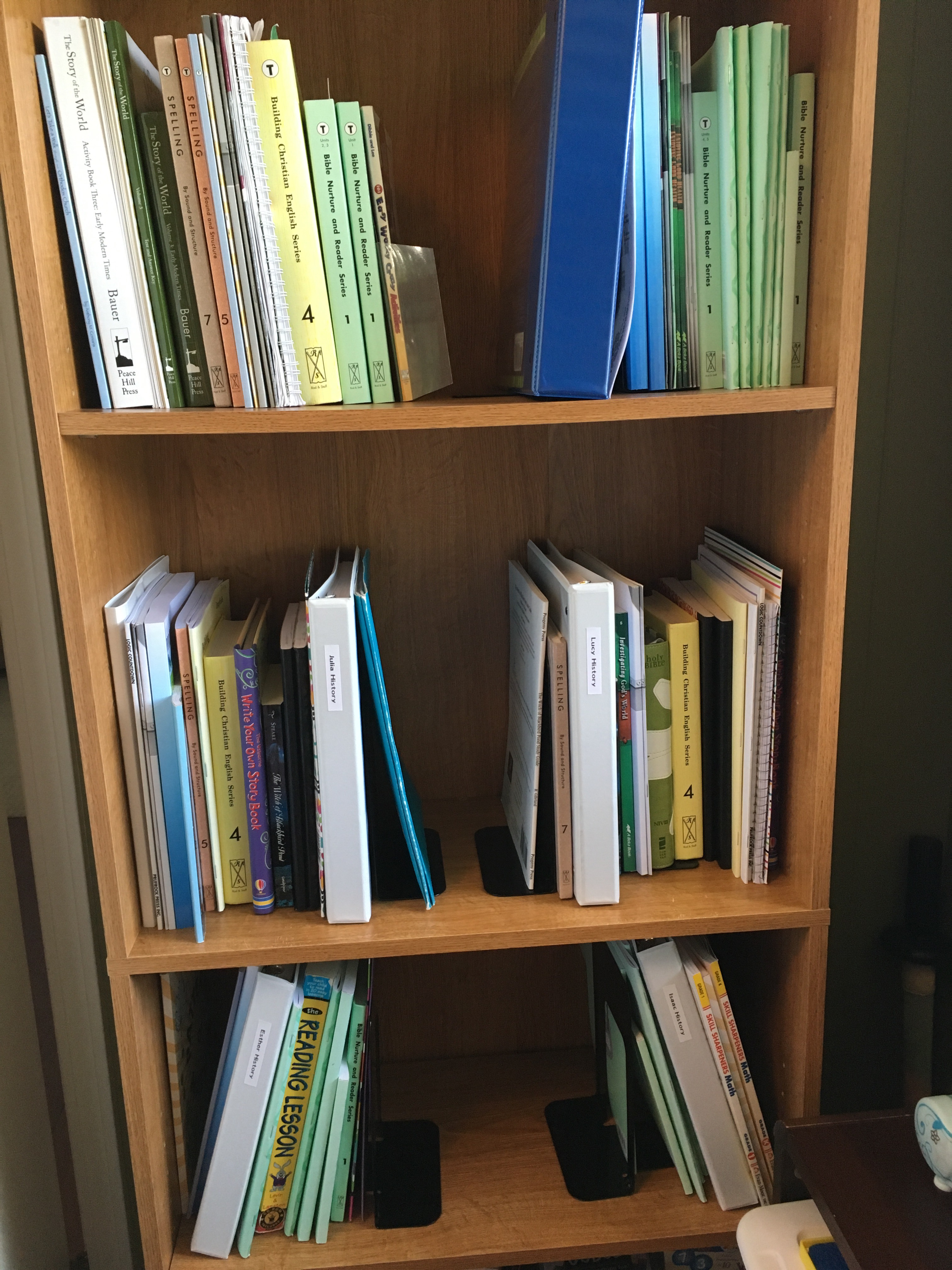 (top shelf: mom’s books and teacher guides; middle shelf: Lucy and Julia each have a side; bottom shelf: Esther and Isaac)