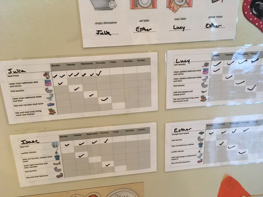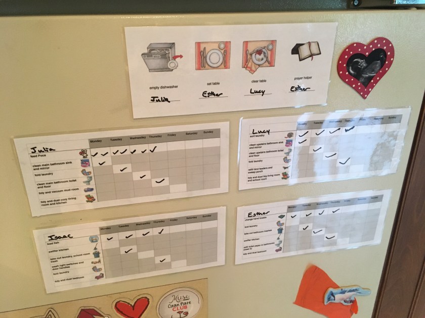 Our kiddos know that everyone working together helps our house run smoothly. If we are struggling with chores I will sometimes tag something fun on the end: “Lets finish up our chores and then we can all go for a walk.”, or “Once we get this living room picked up we can get out a big puzzle.” and so on. Of course sometimes its: “Get your chores done now or else!”. We have a quick general clean up time before bed where everyone picks up toys and things that get scattered around the house. On Saturdays we will sometimes work together on extra chores – picking up sticks outside so Daddy can mow, helping mom put away groceries, etc. Sundays we try to keep for church and relaxing/ doing fun things together. I remind the kids often that “many hands make light work”.