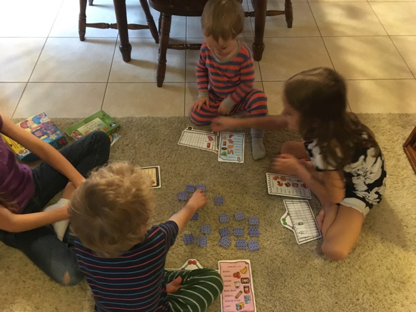 We did go ahead and buy the fruits and veggies booster pack. It comes with two carts and shopping lists and the needed groceries. The backs of the cards match the others, so the pieces fit right in as far as playing the game. I have a couple of very picky eaters – getting them shopping for fruits and veggies is a good thing, even if it is pretend! This allows six people to play (four people can play the original game without this booster pack).