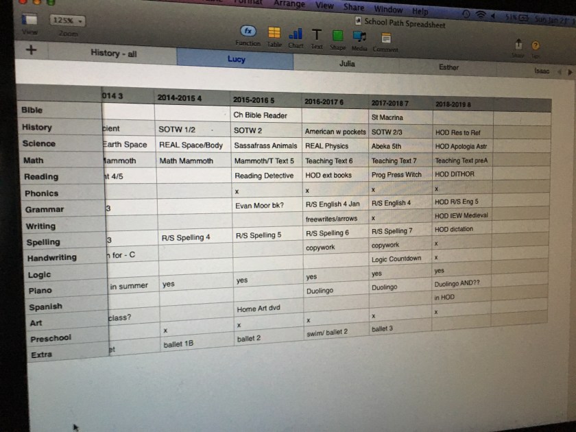 This past week I have been working on a spreadsheet of all the curriculum we’ve used over the years for each child. You can see across the top I have a page for each child: along the left side are the subjects, and at the top are the years, beside the year is the grade that particular child was in. I haven’t finished filling these in, but its been extremely helpful. I can quickly look and see for example that Isaac was only two when we did our human body study, so we’ll do that again with him. It also helps when planning for my younger kids future school years. We’ve been homeschooling for so long and with a variety of things; I don’t want to forget about any of these fun resources when it comes time for the younger ones!