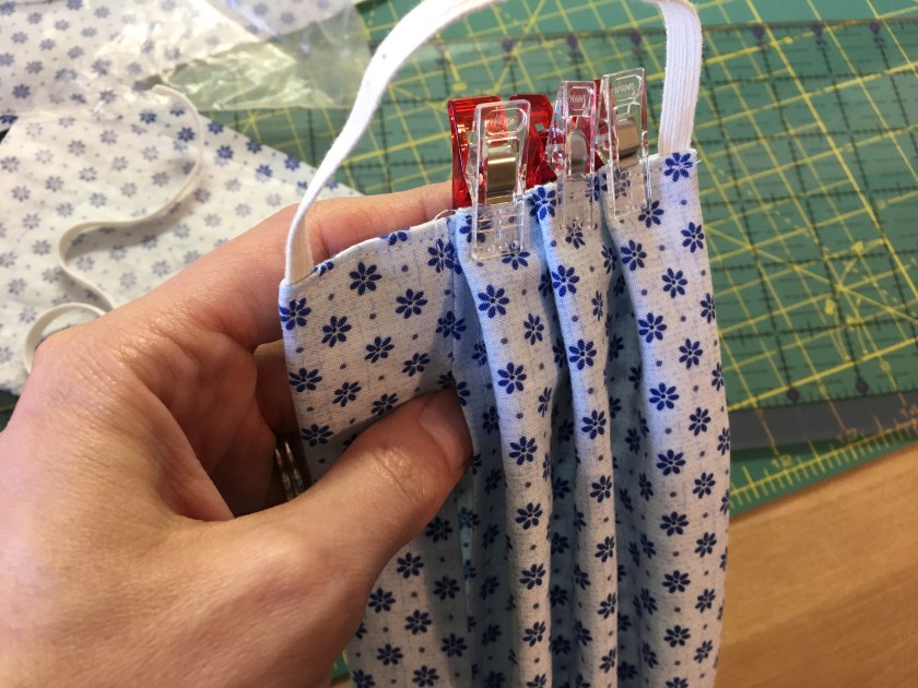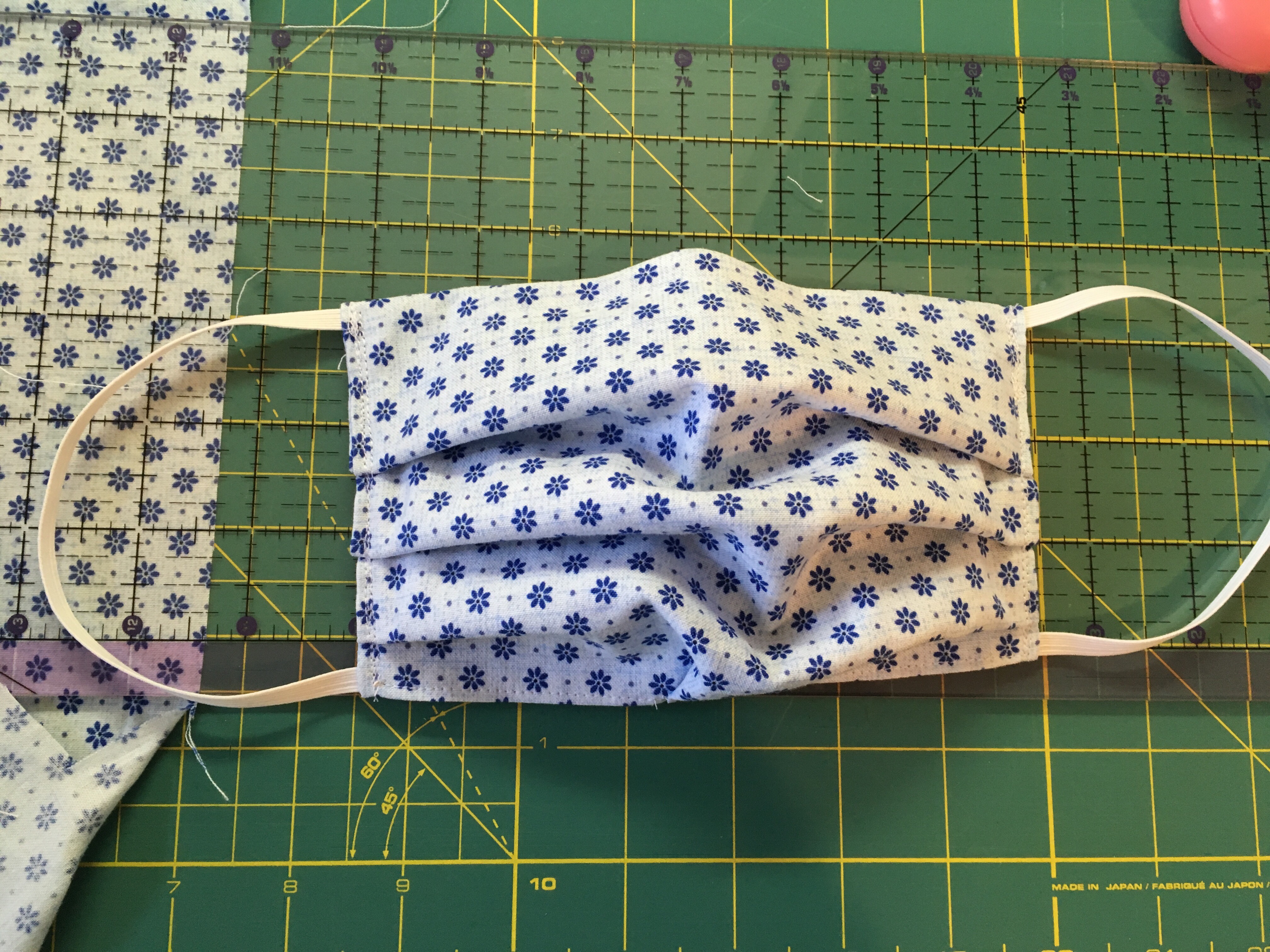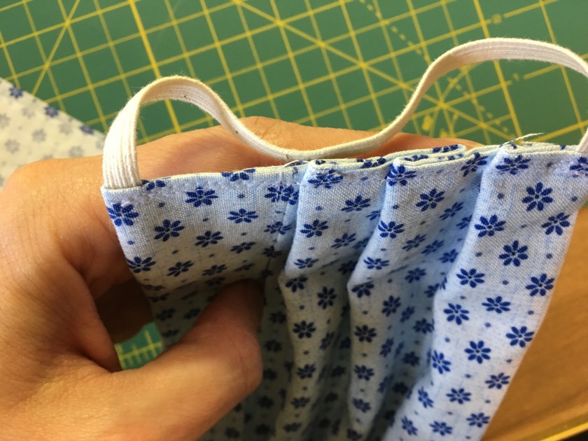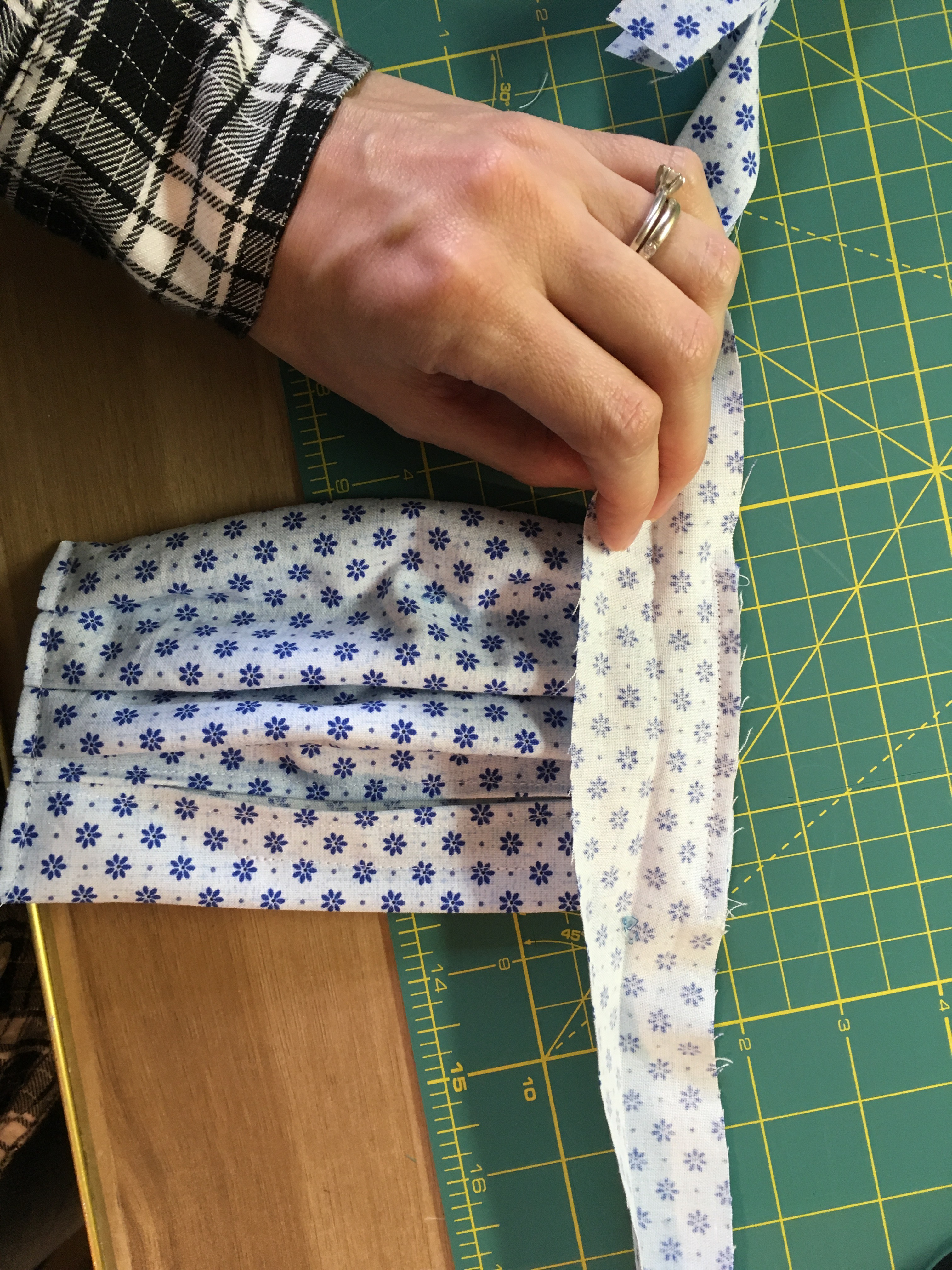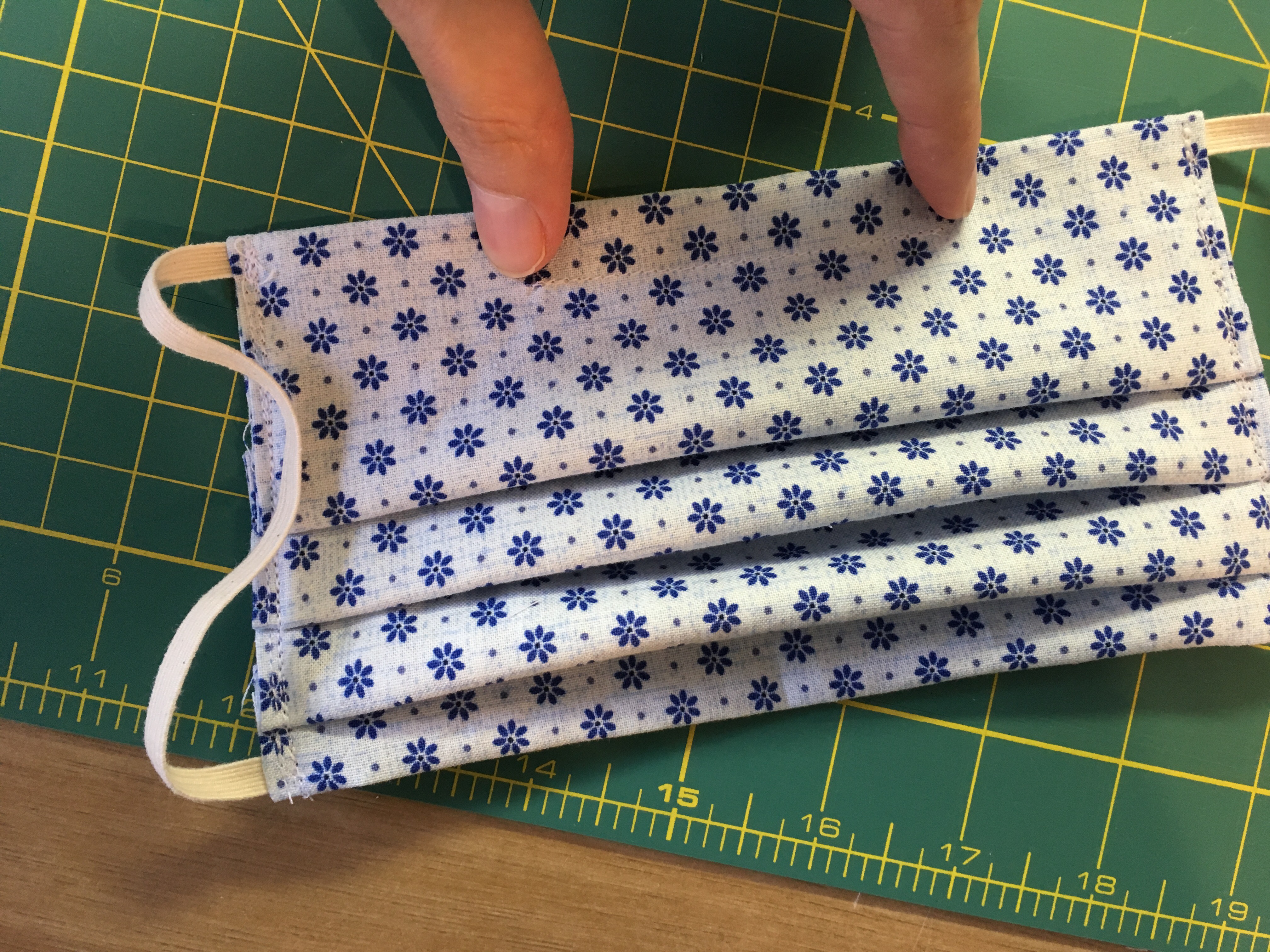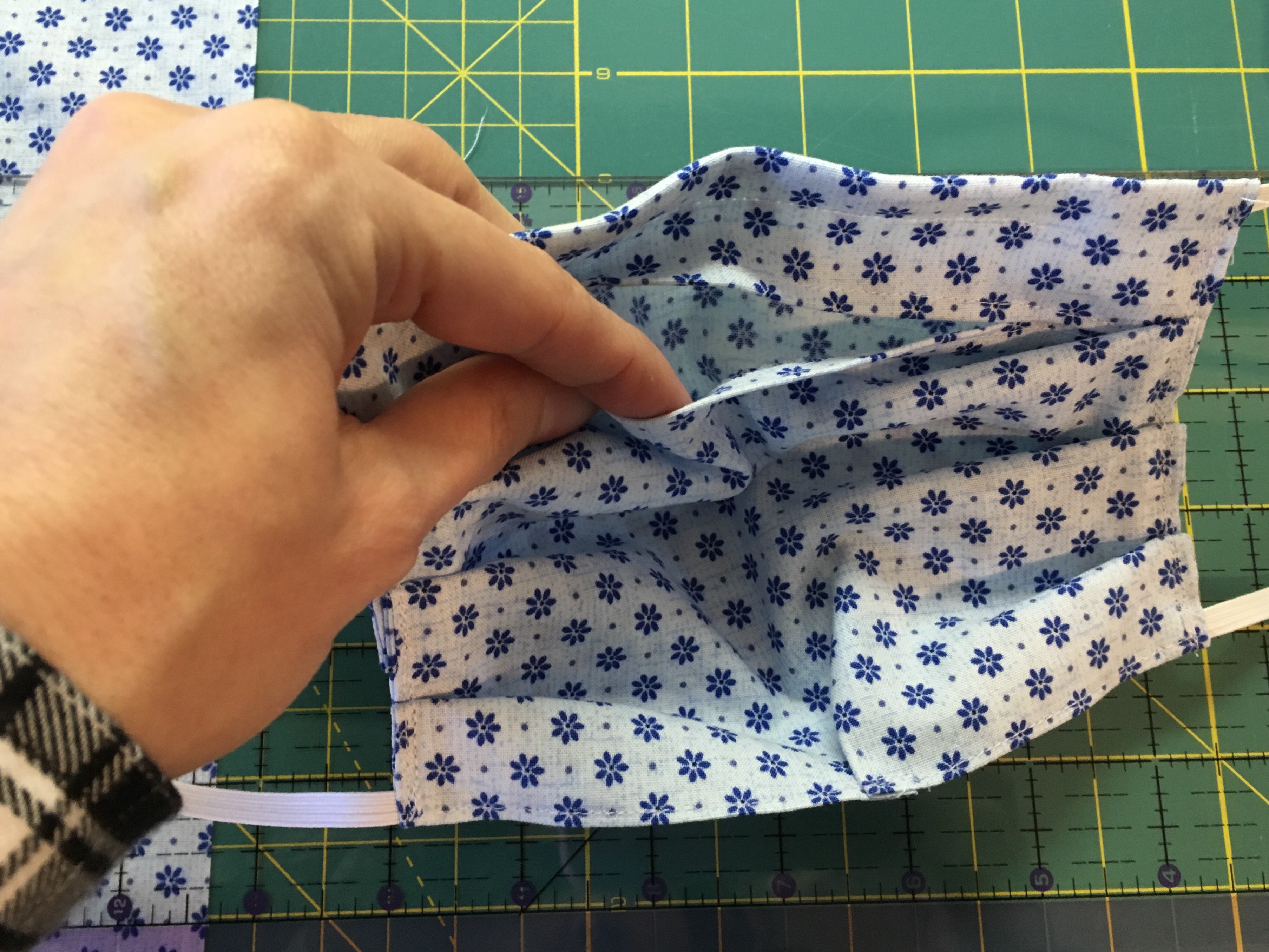 In the very center of the bottom of the mask, make a little fold and sew back and forth across it. This helps the mask to fit nicely around the chin.