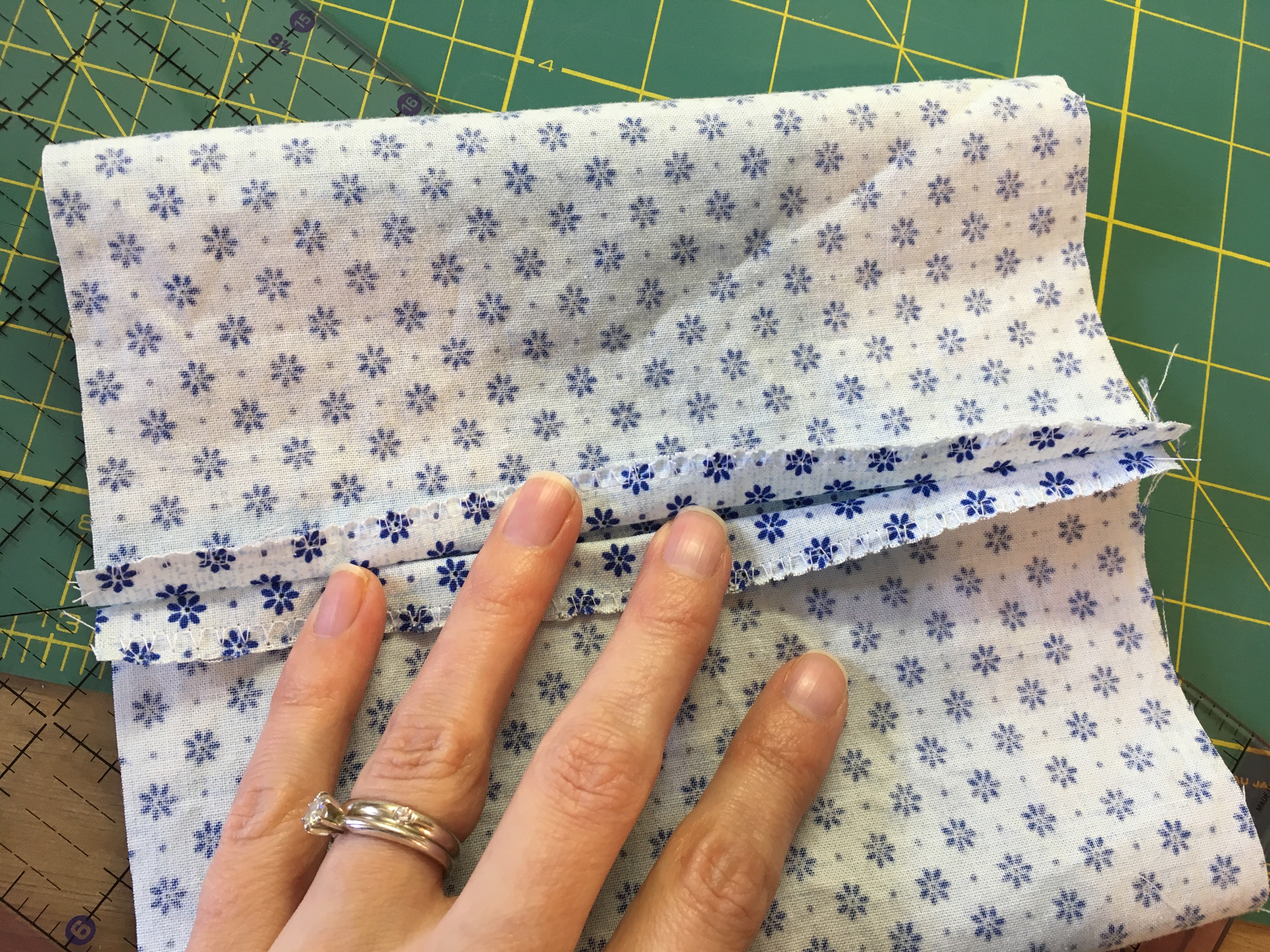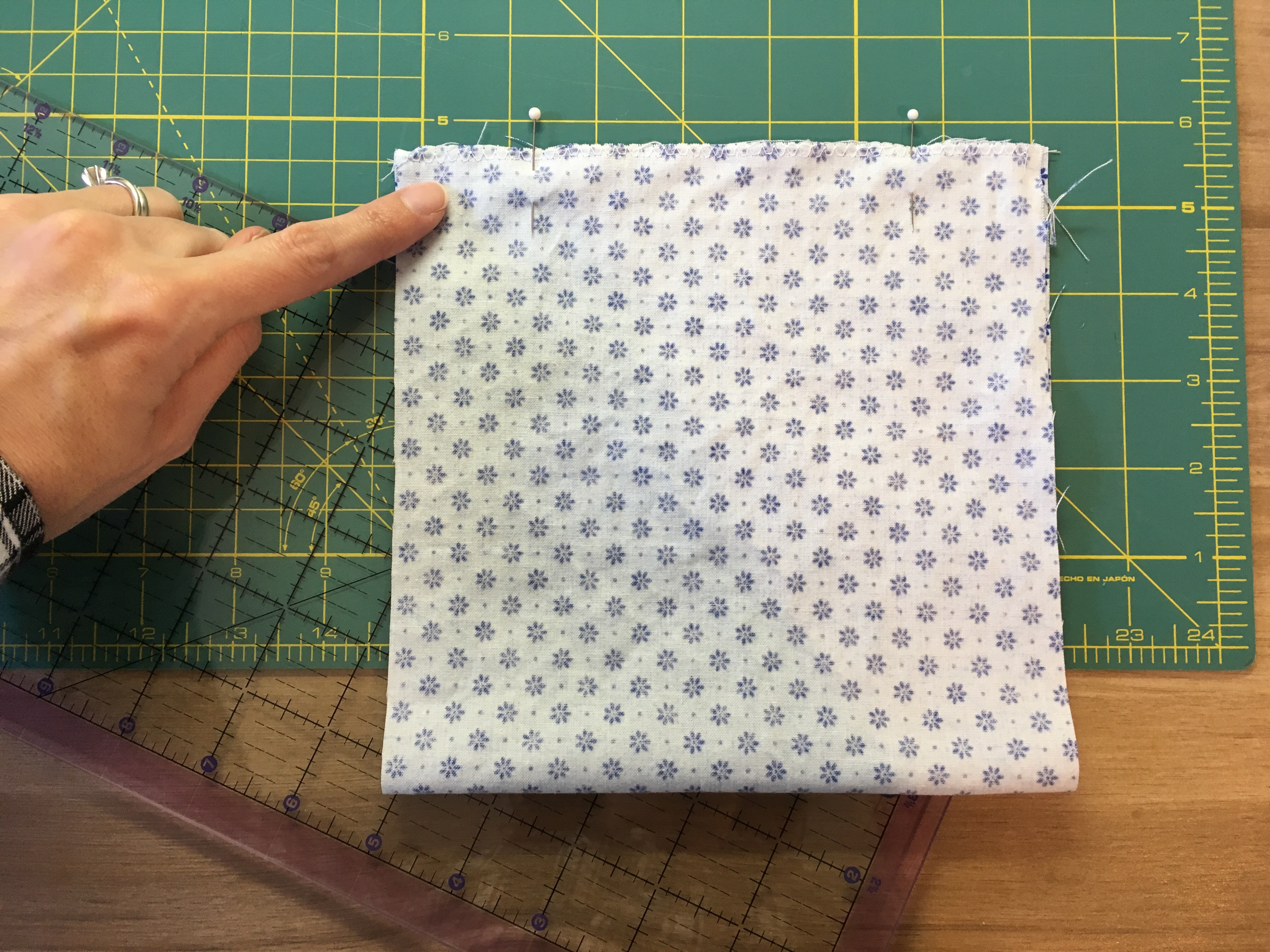 Fold your piece in half, right sides together. Place pins 1 1/2″ in from each edge and sew, leaving the middle open.