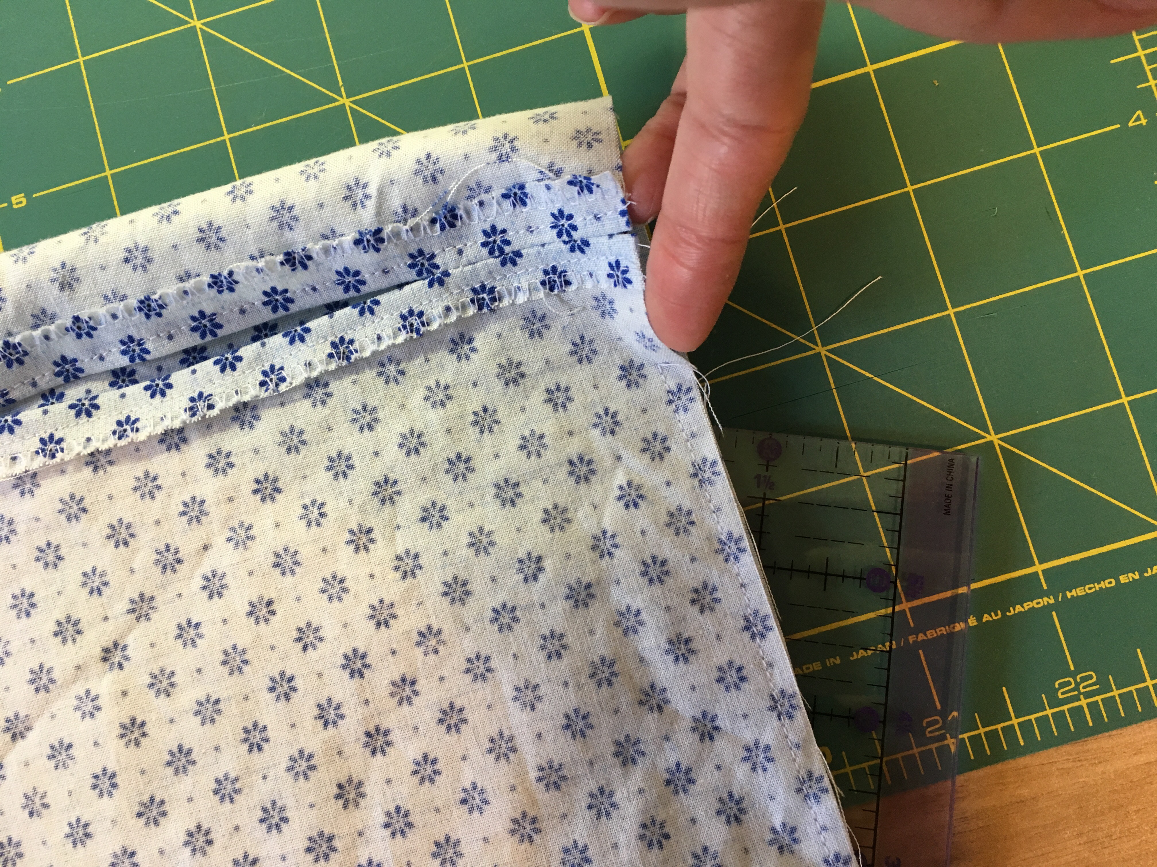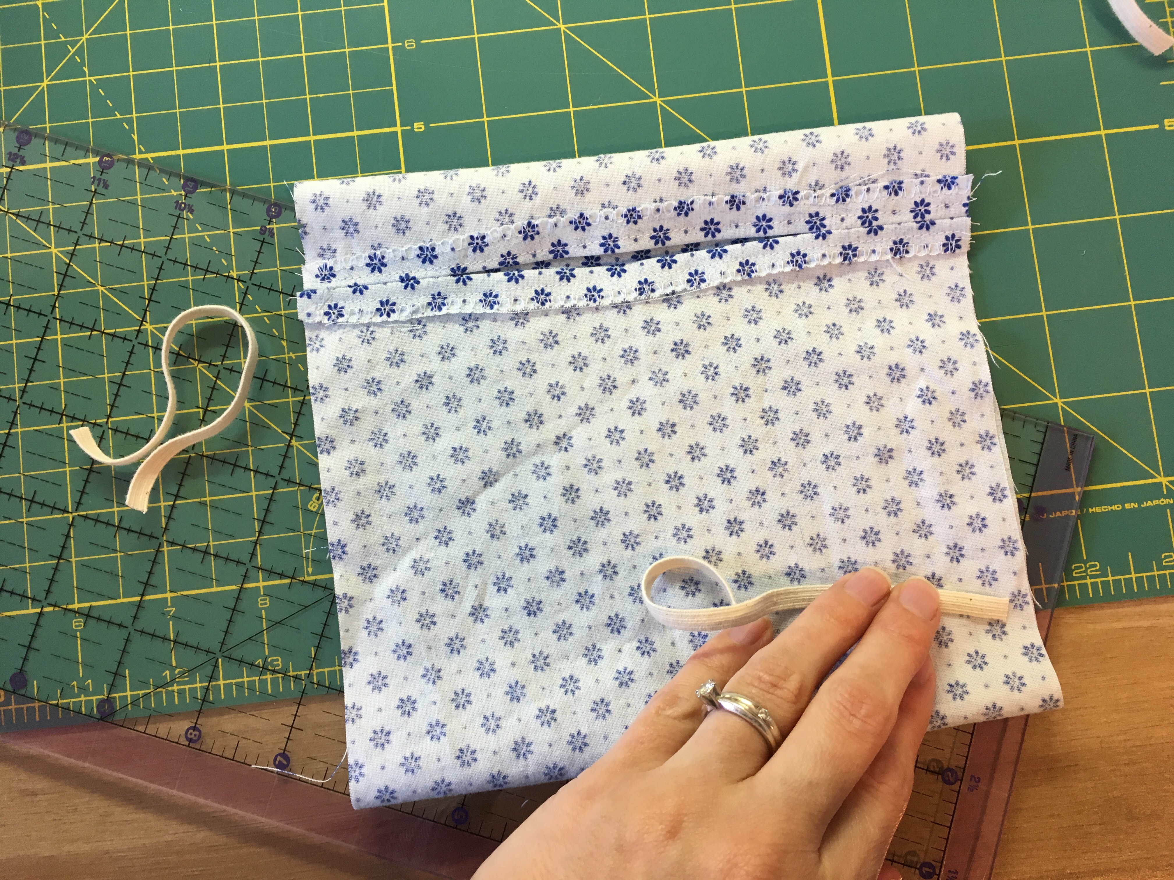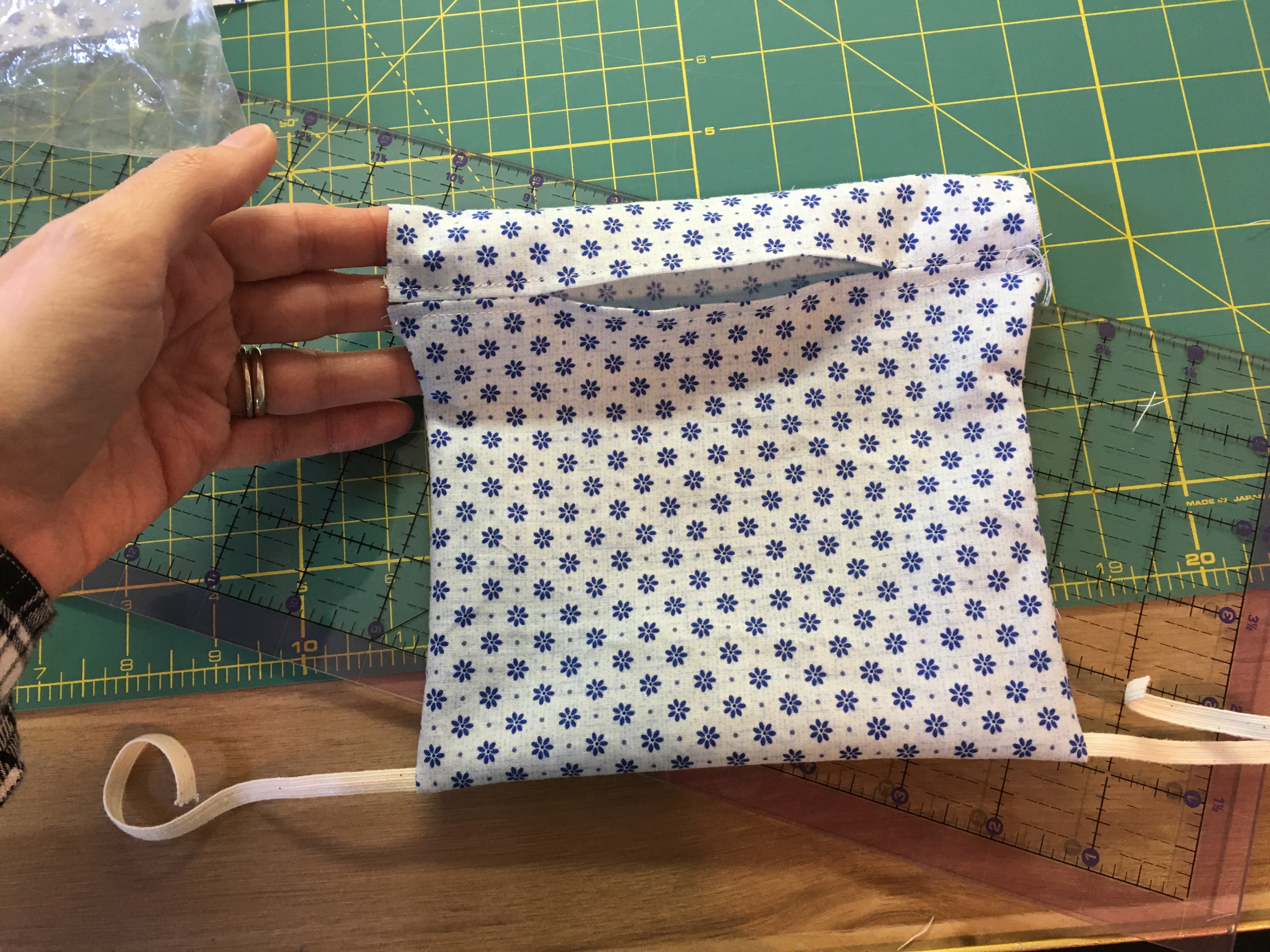 Now turn it right side out. Grab the free end of the elastic and tuck it in the top corner. Turn the raw edges in and seal them up at the same time. Sew down one side, across the bottom, and up the other side (tucking in the other edges and sticking the other elastic in, just as you did on the first side).