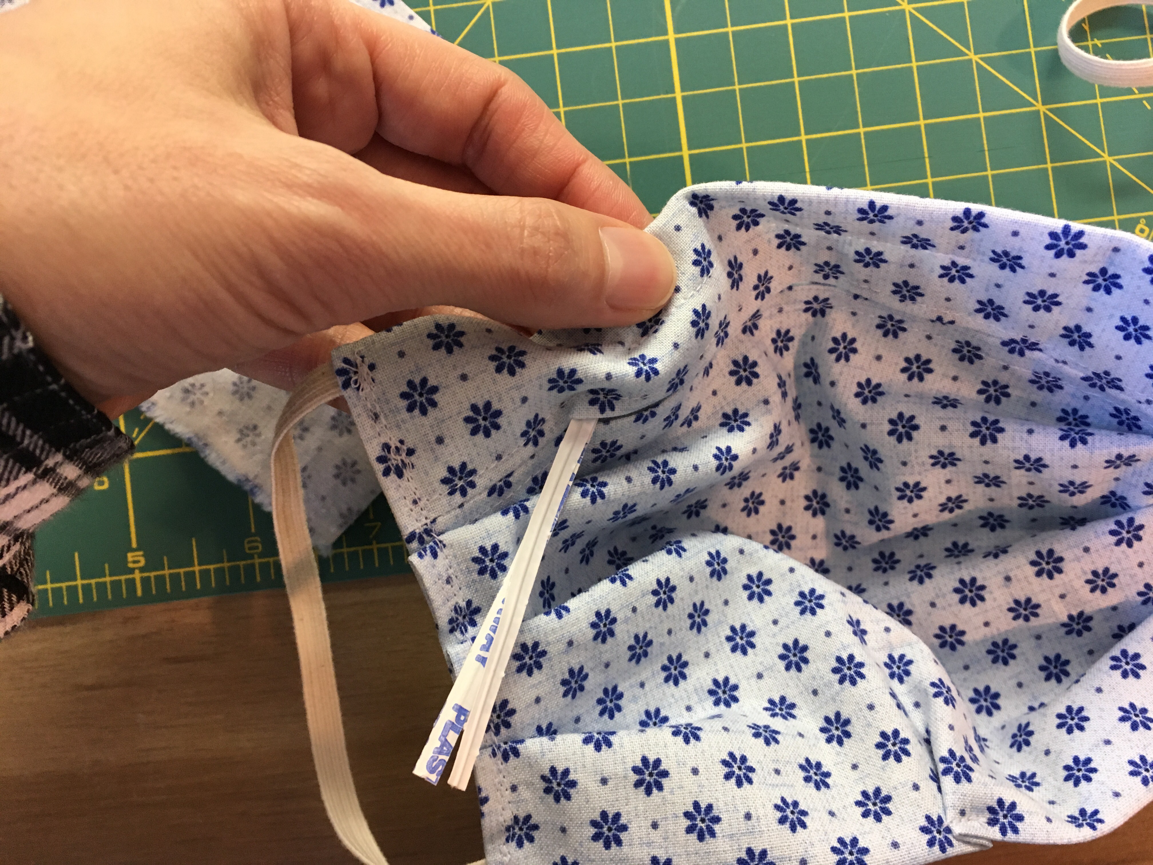 I’ve been using two pieces of elastic, 8″ each. This is where we stray a bit from the video… leave the piece inside out as shown and tuck one end of the elastic inside in the bottom corner and sew up the side, leaving 3-4″ open – don’t close the side all the way. Be sure you situate the opening near the top of one side like this: (It should even be a little bit farther up than shown, you just need to leave space for the nose wire channel you’ll make in a minute.)