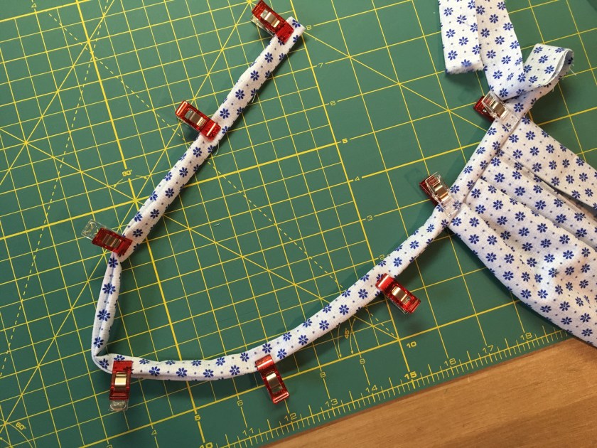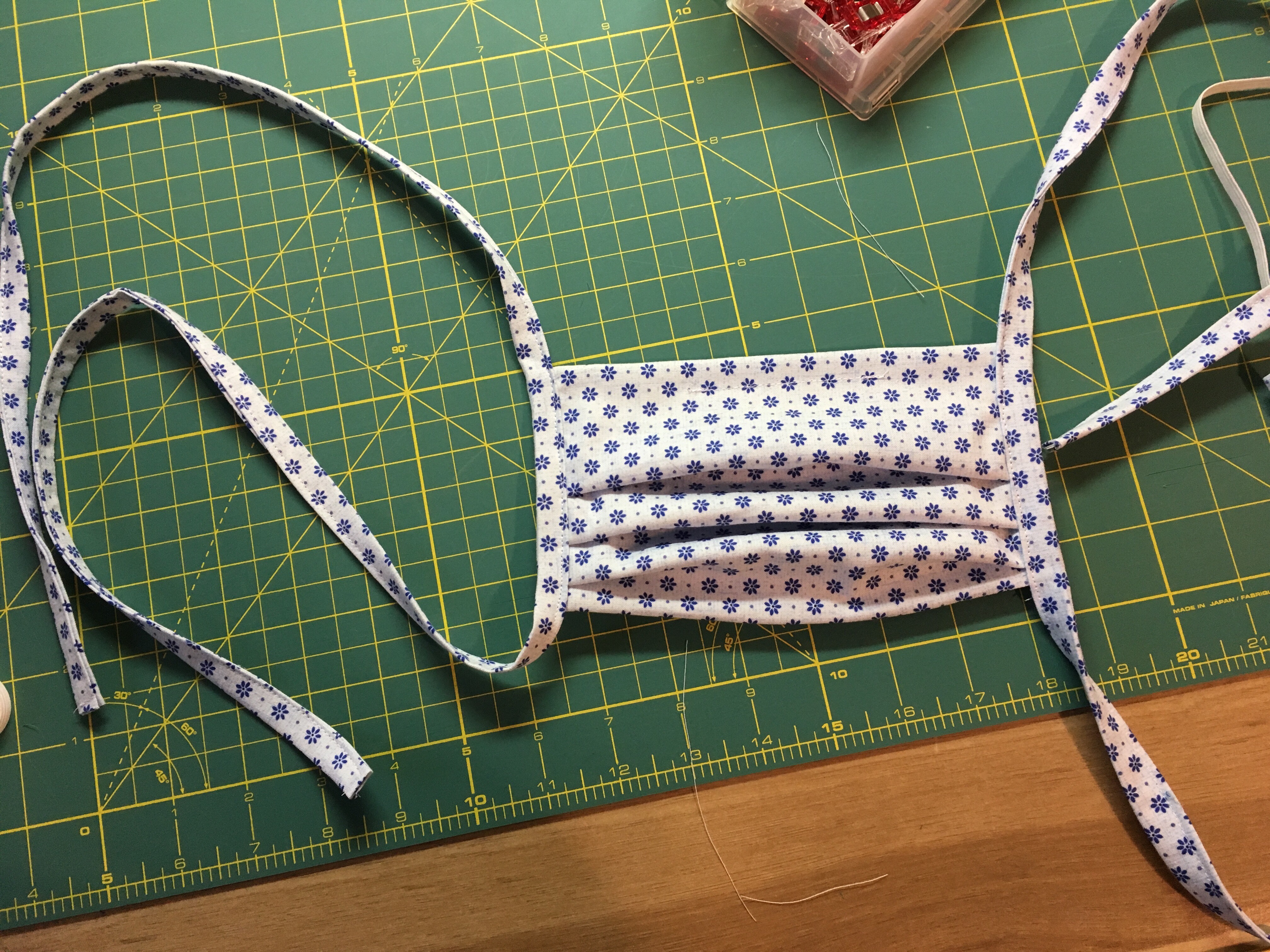 Ok, for versions 2 and 3, keep scrolling. Elastic is hard to find around here because all the crafters snapped it up to sew masks with! I’ve made two different versions of this mask with cloth ties. For this version, make four cloth ties (15-18″ each is what I’ve heard is best). Add them in right where you would place the elastic, using the above pattern pretty much the same way. My tie pieces started at 2″ wide, iron them in half the long way, then fold the edges in just like double fold bias tape and sew it up, tucking in the raw edge on the one end that will be loose.